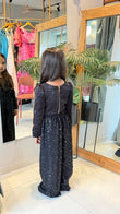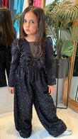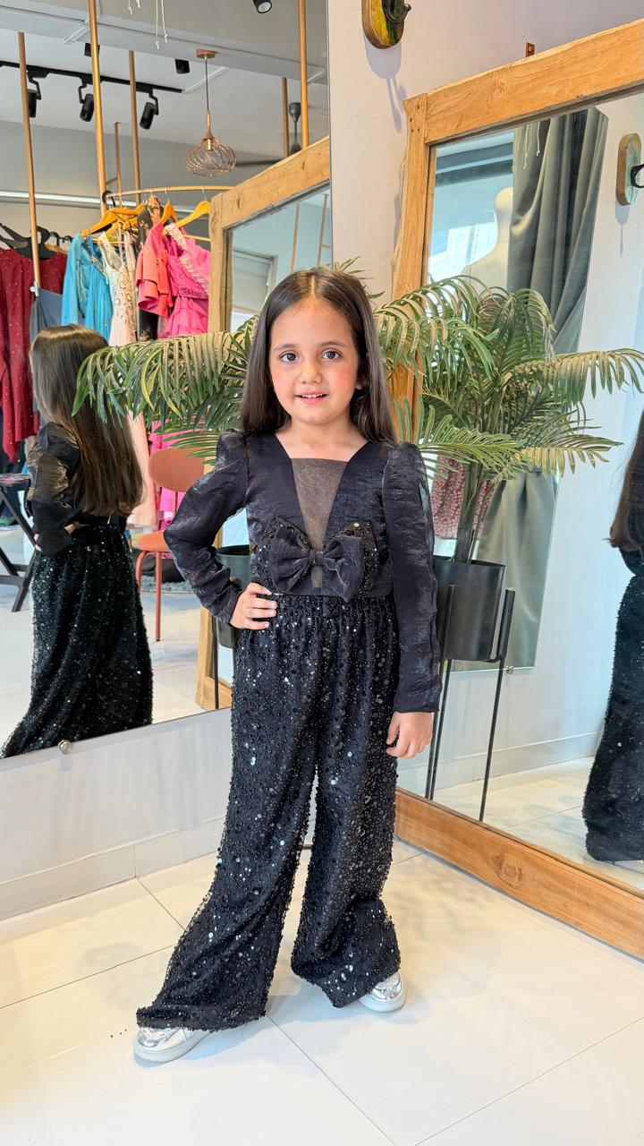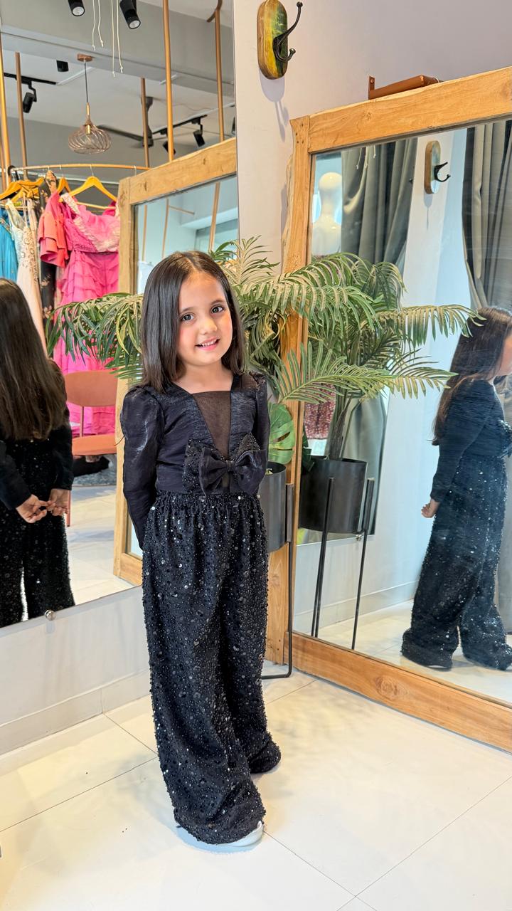Let your little fashionista steal the spotlight in our Black Sequin Wide-Leg Co-ord Set for Girls. This premium party co-ord features a rich black textured top adorned with a statement bow and elegant sheer neckline for a sophisticated boutique look.