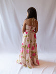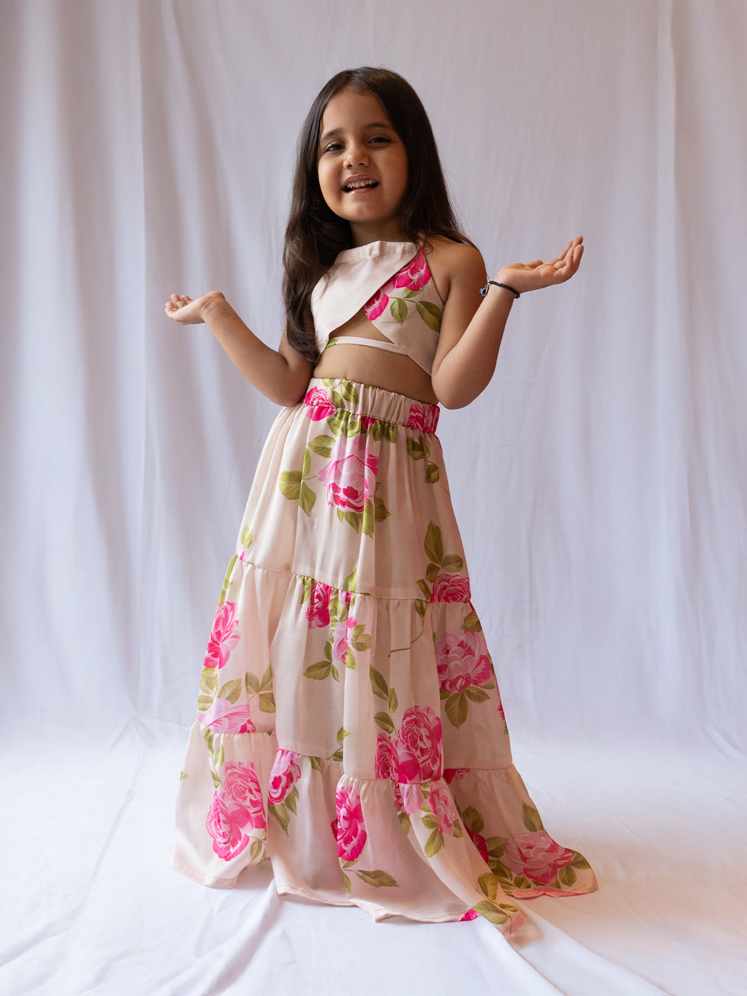 A charming floral co-ord set crafted in soft, flowy fabric featuring vibrant pink blooms on a pastel base. The halter-style crop top with a chic cross neckline pairs beautifully with the tiered maxi skirt, giving an effortlessly elegant look. Perfect for summer parties, vacations, or festive occasions — this outfit brings a blend of comfort and style to your little one’s wardrobe.
