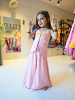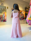 A graceful blend of softness and sparkle, the BlushBow plazo Set features a sleeveless pink top with scalloped edges and handworked bow appliqués. Crafted in Georgette with cotton lining for comfort, it pairs with a flowing plazo, perfect for festive twirls, playful elegance, and photo-ready charm.