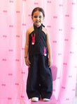 Add a bold and playful touch to your little one’s wardrobe with our Bunny Halter Co-ord Set for Girls. This stylish black co-ord set features a halter-neck asymmetrical top adorned with cute bunny appliqué detailing, paired with relaxed-fit wide-leg pants for effortless comfort and movement.