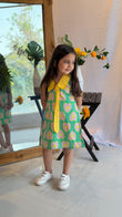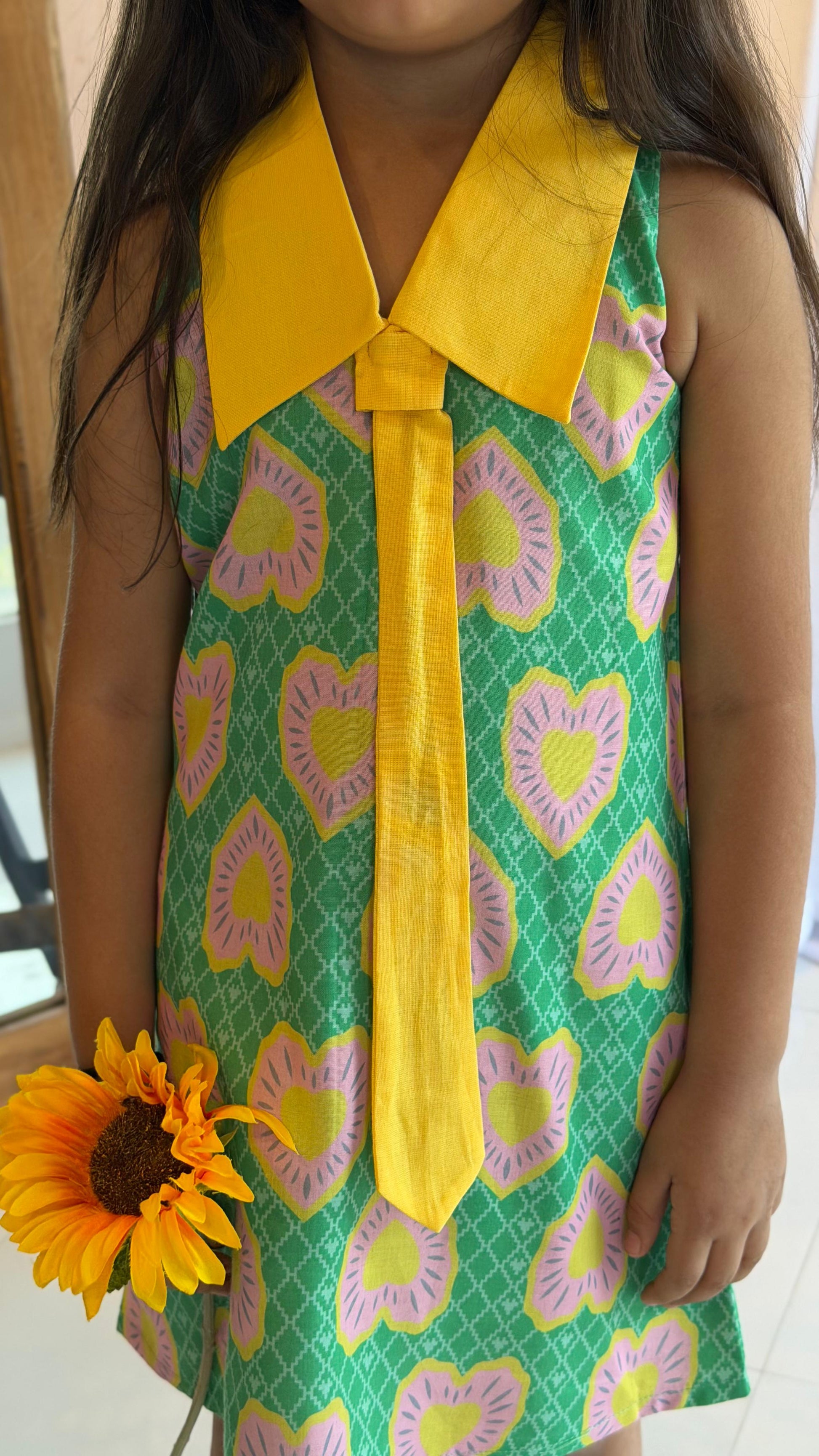 Add a burst of fun to your little one’s wardrobe with our Green Heart Print Collar Dress. Designed in a vibrant green base with playful heart motifs, this sleeveless dress features a bold contrast yellow statement collar with tie detail that gives it a unique retro-chic vibe.