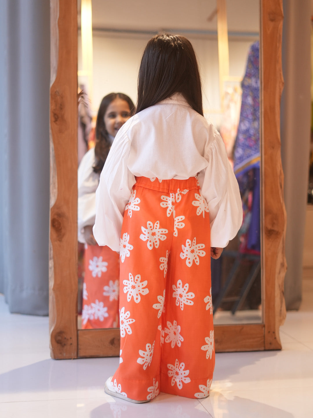Brighten up your little one’s wardrobe with our Happy Flower Co-ord Set for Girls, a perfect blend of comfort and cheerful style. This stylish kids outfit features a classic white full-sleeve cotton shirt paired with vibrant orange wide-leg palazzo pants adorned with playful floral prints.