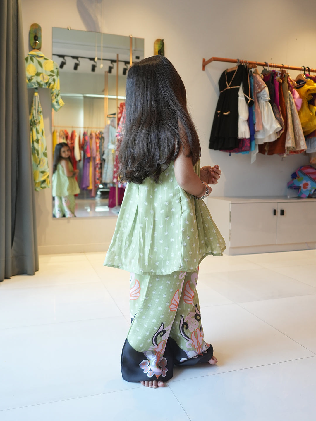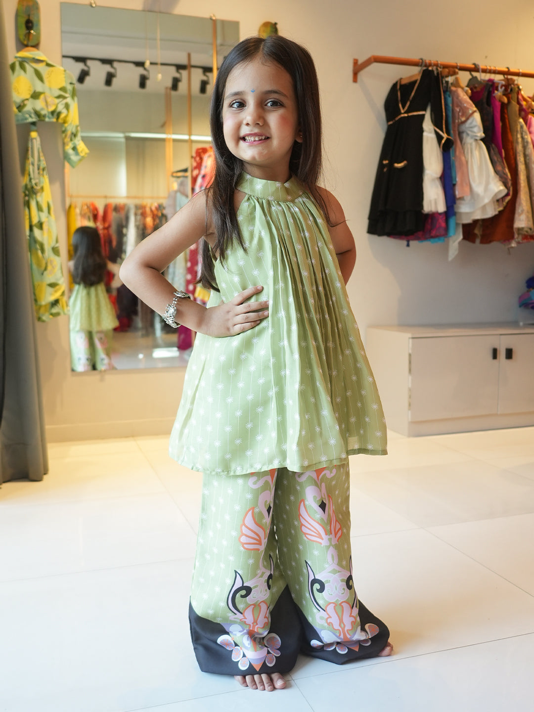 The light green pleated top pairs effortlessly with wide-legged pants. Crafted in satin Georgette with soft cotton lining.