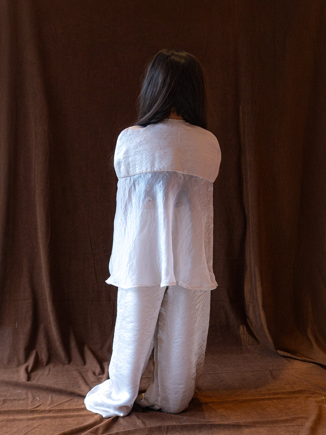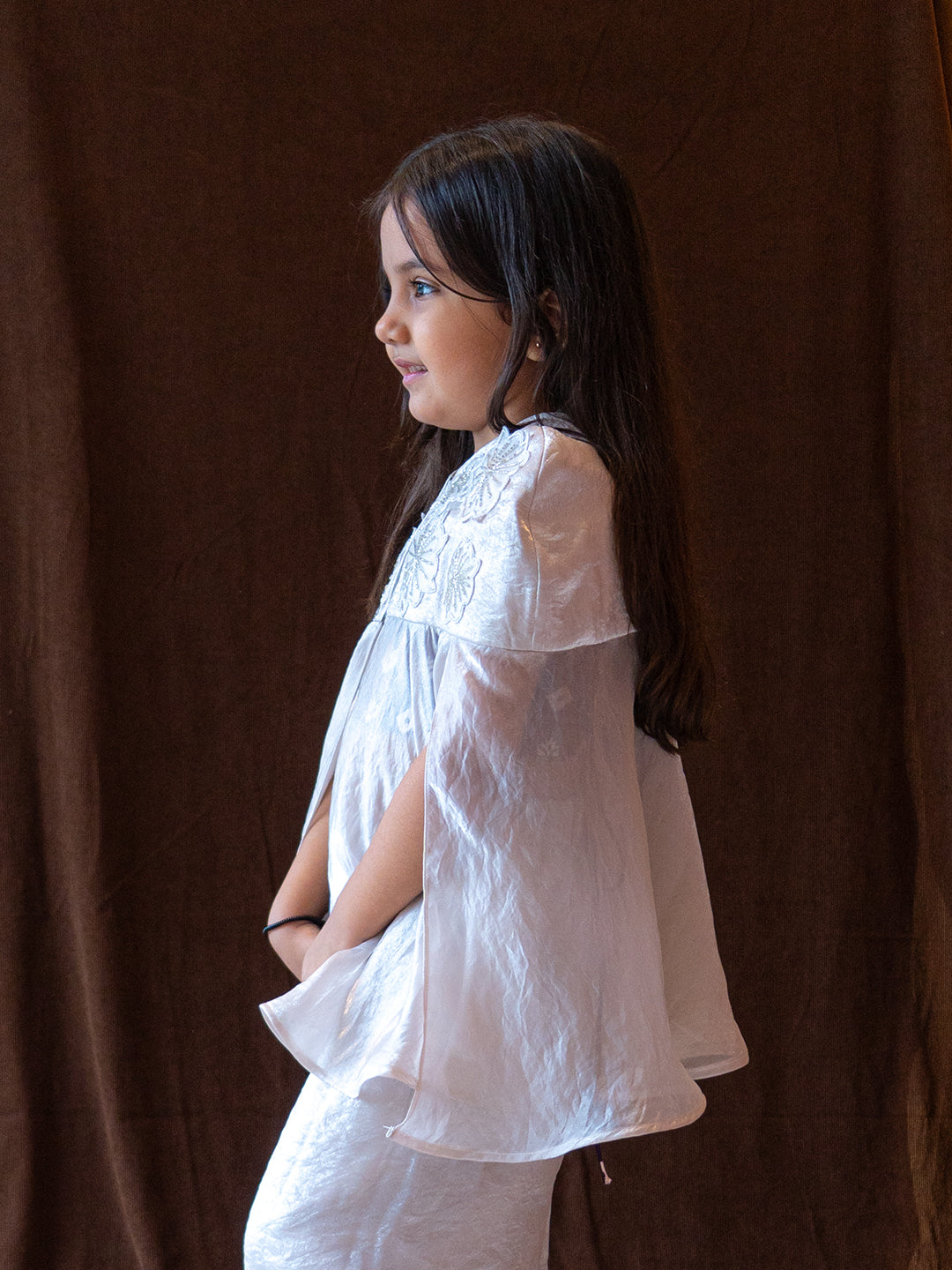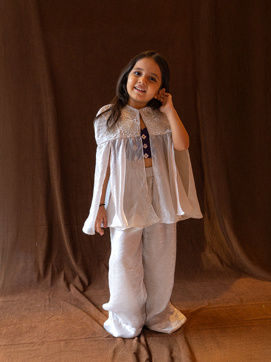 Ethereal and timeless, the Moonlight Whisper Set captures the quiet elegance of a moonlit evening. Crafted from lustrous Sheen Facric, this three-piece ensemble features flowy wide-leg pants, a delicately hand-embroidered floral cape, and a coordinated inner top.