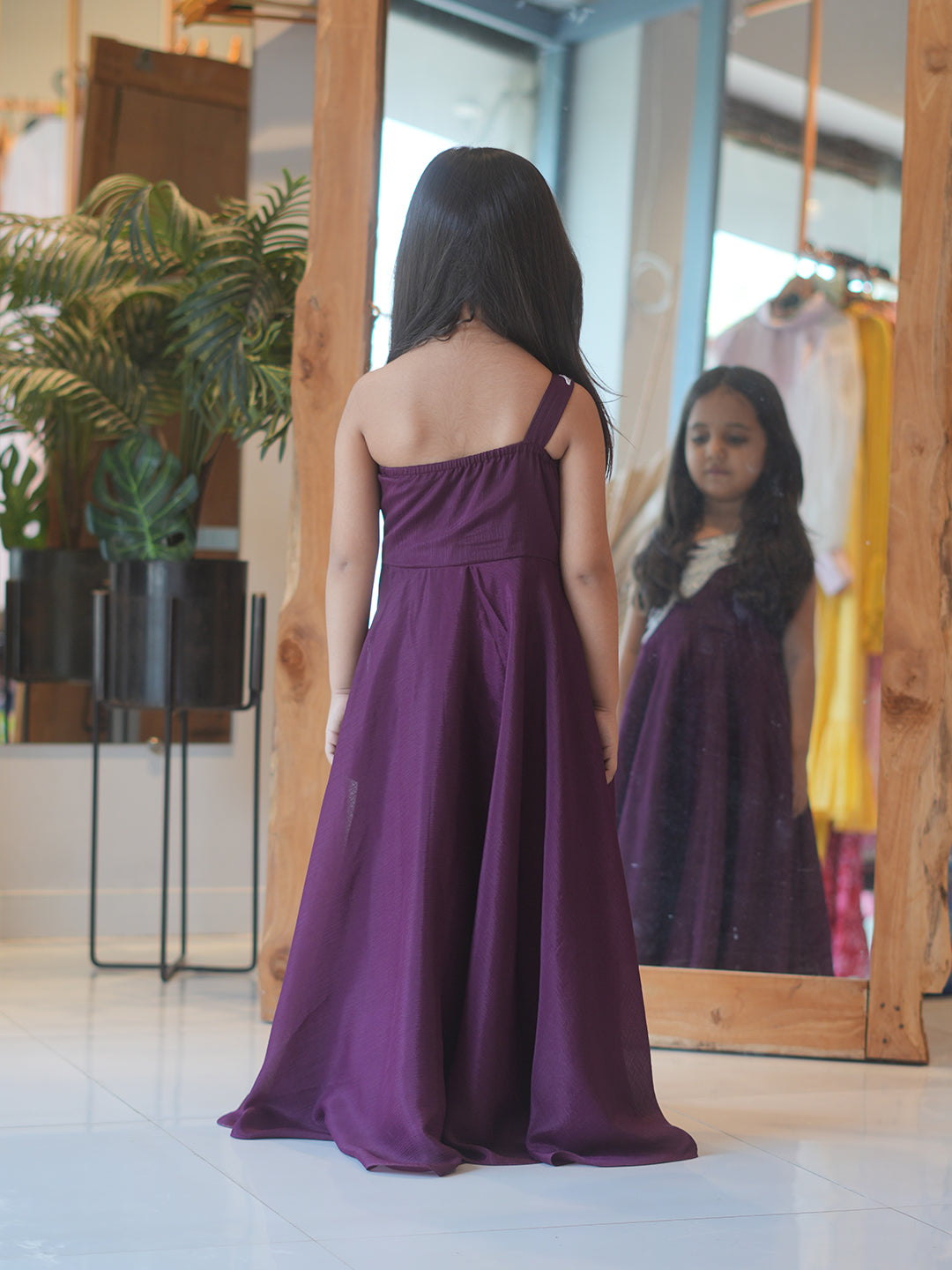 A stunning plum one-shoulder gown for girls, designed with a flowing flare and elegant silver embellishment on the bodice. Perfect for birthdays, parties, weddings, receptions, and photoshoots. Made with soft, premium fabric for all-day comfort, this gown gives a royal and modern look your little princess will love. Ideal for moms searching for premium kids party gowns with a stylish designer touch.