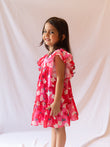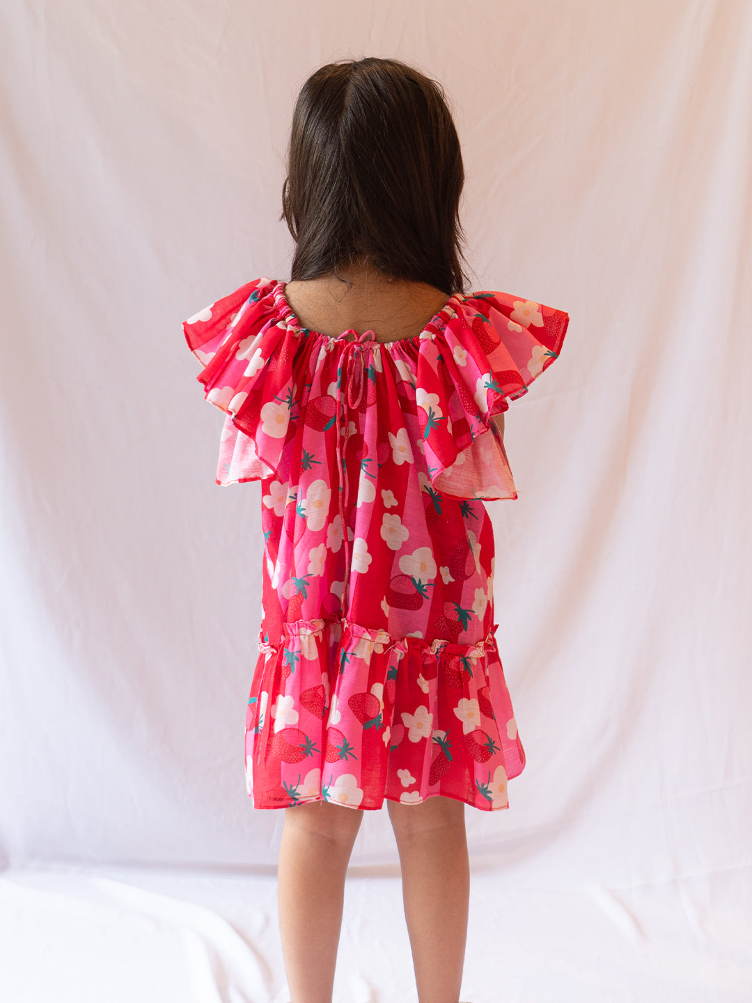 This vibrant pink dress features a playful strawberry and floral print that’s perfect for sunny days. The ruffled sleeves and tiered flare add a touch of charm and twirl-worthy fun — making it ideal for casual outings, birthday parties, or holiday picnics.