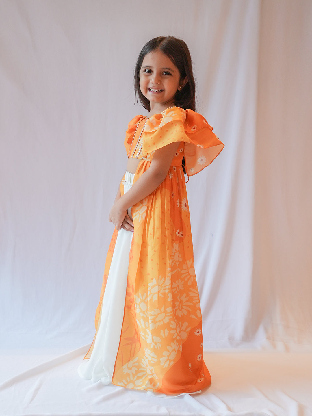 Designed for little fashionistas who love to twirl, this breezy ensemble features puffed sleeves and a striped bodice that channels retro charm. The flared skirt bursts with floral joy in shades of citrus and cream, while a crisp white panel adds contrast—like a sunbeam slicing through a garden. Perfect for festive frolics, birthday giggles, or a stylish stroll through everyday magic.